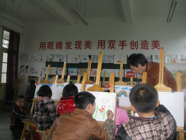 叮铃铃……铃声一响,各个活动阵地就活跃开了,热闹非凡。腰鼓室内,腰鼓队棒槌挥舞,彩绸翻飞,陶醉在欢快的鼓乐声中;操场上,同学们滚着铁环,奔走如飞,场面煞是热闹;美术室内,同学们或工笔细描,或挥笔速写,用五彩画笔描绘着缤纷的世界……这里是福建省三明市泰宁县梅口乡中心小学少年宫最平常的一天。