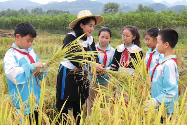 在连南瑶族自治县石泉小学的“田埂拾趣”工作坊,四年级学生邓晨昊、六年级学生邓晨睿灵巧地将金黄的玉米叶编织成一只展翅欲飞的鸟儿。“瑶山石趣”“玉米之约”等课程,让学生完整经历从种植、收获到艺术创作的全过程。